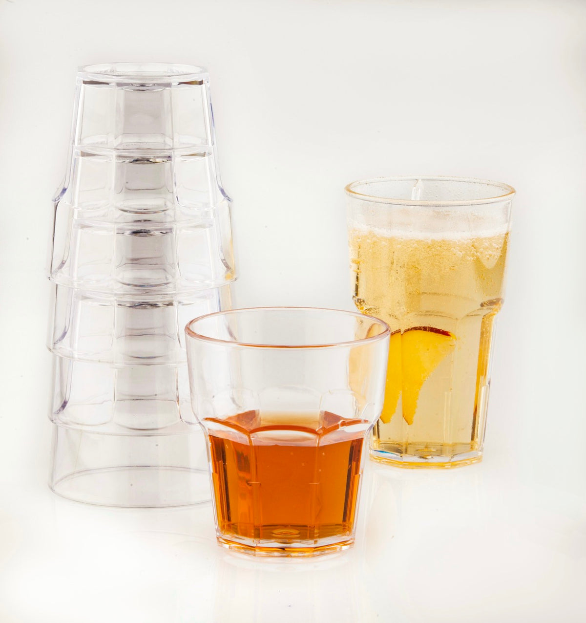 Shatterproof reusable glass, made from food grade plastic. Tested over 1000 dishwasher cycles with no visual detraction.
